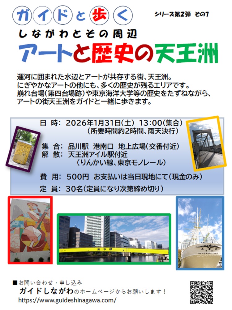 運河に囲まれた水辺とアートが共存する街、天王洲。にぎやかなアートの他にも、多くの歴史が残るエリアです。崩れ台場(第四台場跡)や東京海洋大学などの歴史をたずねながら、アートの街天王洲をガイドと一緒に歩きます。