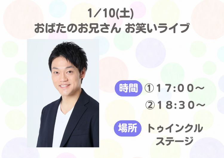お子様に大人気の「おばたのお兄さん」が登場!!■開催日:2026年1月10日(土)■時間: 1 回目 17:00~ 2回目 18:30~■場所:トゥインクルステージ (場内MAP)■営業開始時間:16:30■駐車場オープン:16:00
