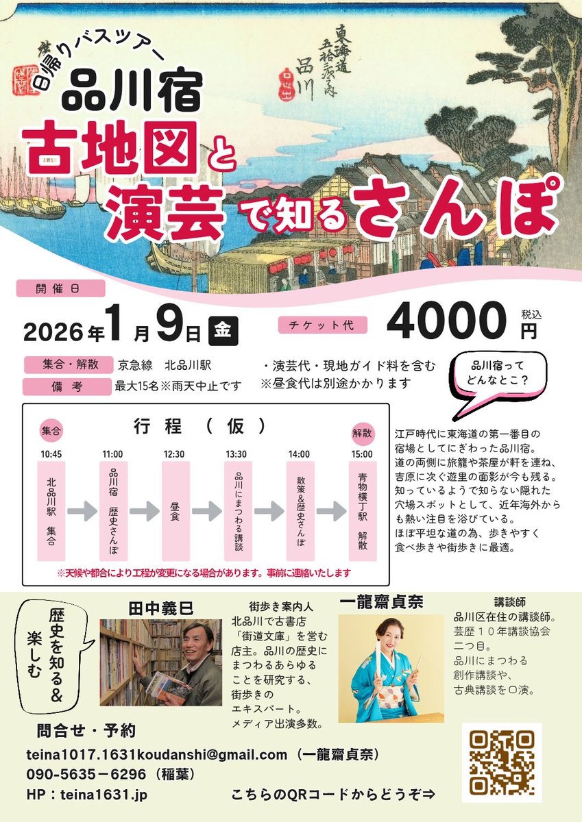 ■内容:日本国内の街道だけならず、世界の街道歩きのレジェンド、そして品川宿歴史まち歩きのエキスパート 品川宿 街道文庫 店主 田中 義巳 氏の品川宿案内と講談師 一龍斎 貞奈 氏による品川にまつわる講談