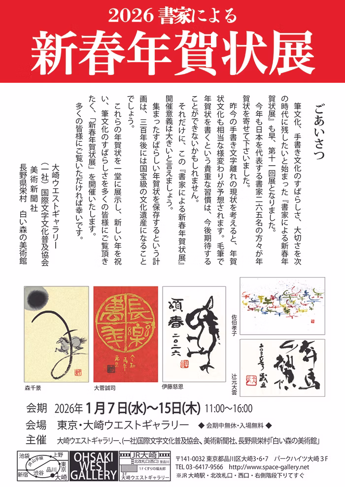 これらの年賀状を一堂に展示し、新しい年を祝い、筆文化のすばらしさを多くの皆様にご覧頂きたく、「新春年賀状展」を開催いたします。
