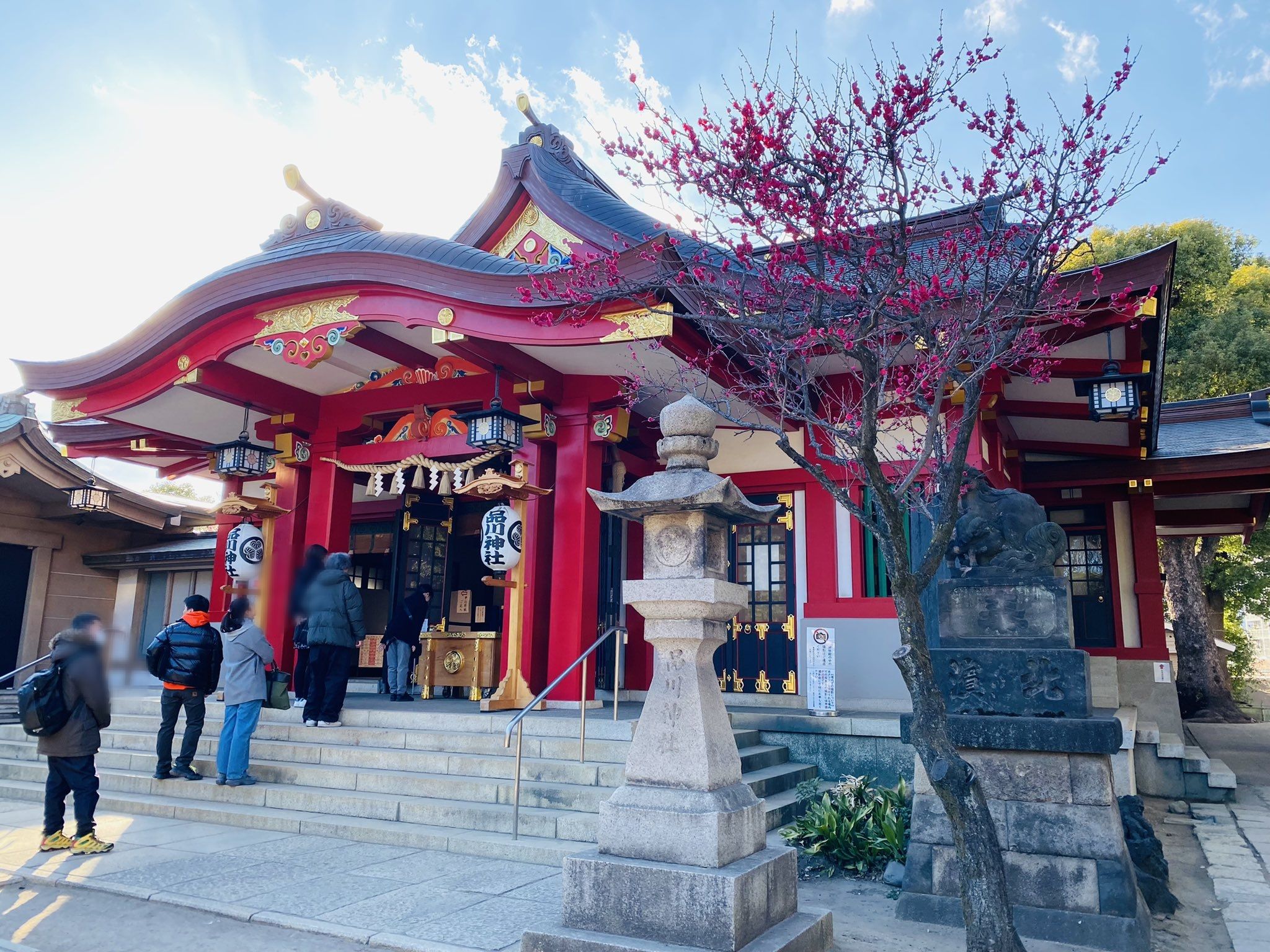 2/5(木)現在、品川神社の御社殿横の紅梅が見頃を迎えています。