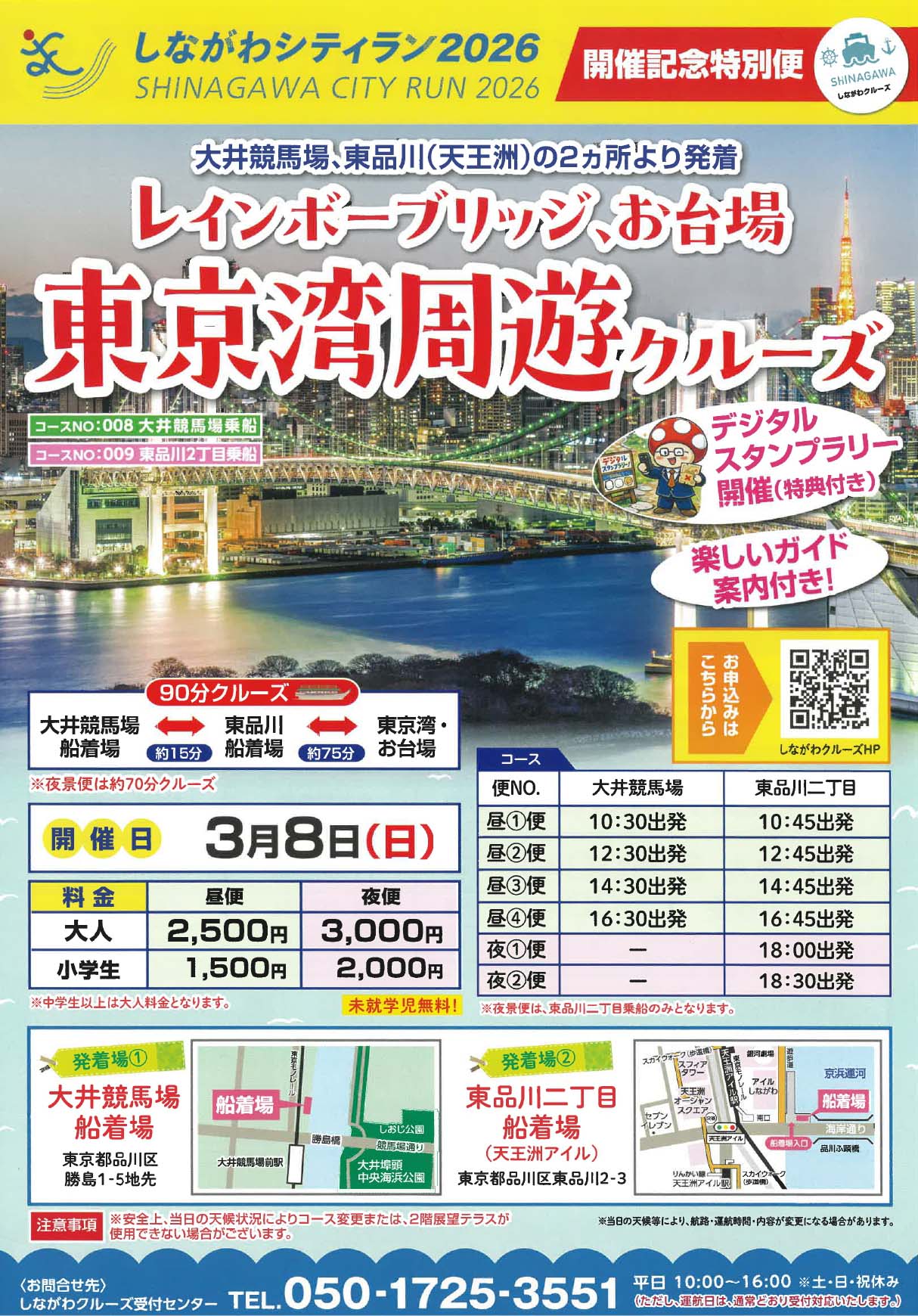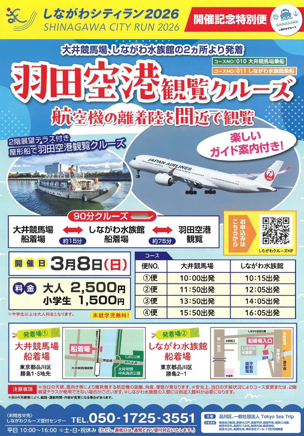 2026年3月の「しながわシティラン2026」開催に合わせ、レインボーブリッジやお台場を船から眺める「東京湾周遊クルーズ」と航空機の離発着を間近で観覧できる「羽田空港観覧クルーズ」を運航。