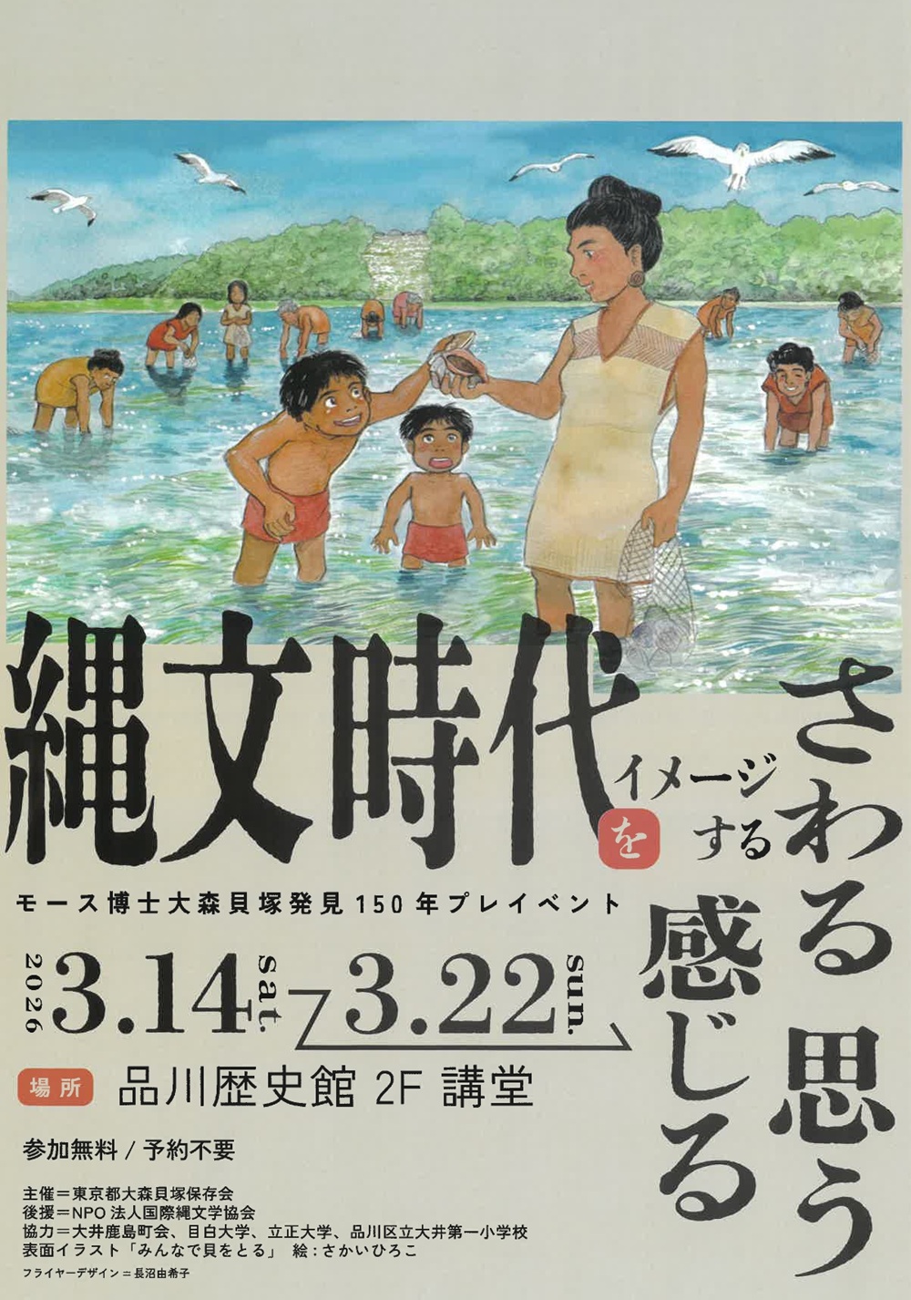 2027年にモース博士の発見から150年を迎える大森貝塚をより深く知るためのイベントです。発掘された土器(復元品)を見たり、イラストや写真を見て、4300年前、大森貝塚で暮らしていた人たちの生活を想像してみませんか。3月20日(金)~22日(日)には、縄文時代の人々の生活を体験するワークショップも開催されます。
