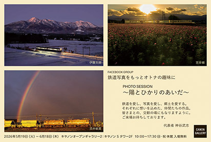 「鉄道写真の神様」と称される写真家広田尚敬氏の写真展が キヤノンギャラリーS品川で開催されることに合わせ、鉄道写真コミュニティ「鉄道写真をもっとオトナの趣味に」の有志90名の写真展を同じビルの2階で開催。このコミュニティにはFacebook上で活動する、鉄道を愛し写真を愛し郷土を愛するメンバー860人が参加。想いを込めた作品を発表し、オトナの趣味としての鉄道写真を目指して活動している。