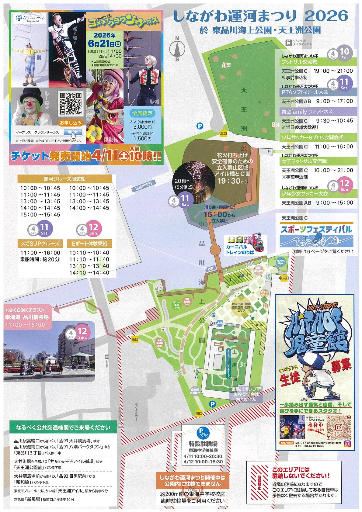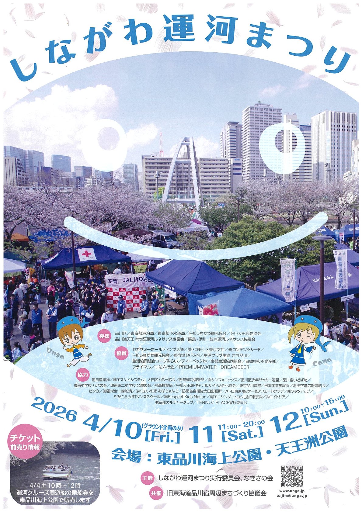 品川宿ゲストハウス&ツアーズ ブース(参加無料)・運河クルーズ周遊船(参加有料 お一人 2,000円)・水辺の花火 写真展(しながわ運河まつり公式カメラマン 秋富 晢生)・大道芸パフォーマンス(士魂流水 4/11のみ・SOBUKI)・花火打ち上げ(4/11 20時~ 5分ほど)