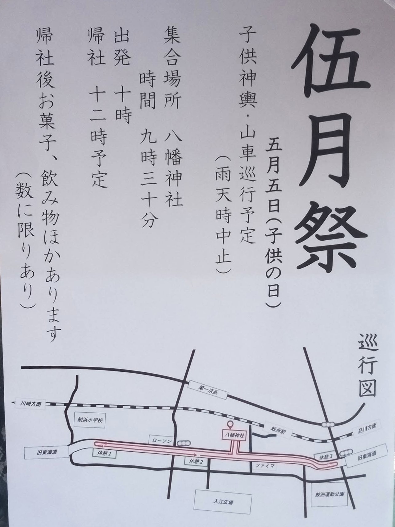 日にち:5月5日(こどもの日)集合場所・時間:八幡神社 9:30巡行時間:出発 10:00 帰社 12:00予定