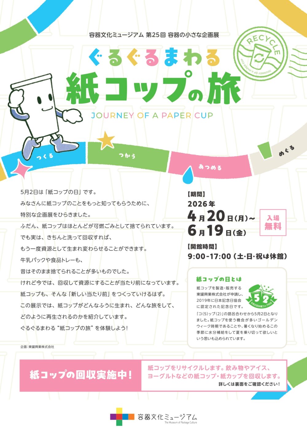 今回の企画展では、5月2日の紙コップの日にあわせ、紙コップの再資源化に向けた最新の取り組みを紹介。紙コップの製造から使用、洗浄、回収、再資源化、そして新たな製品へと生まれ変わるまでのプロセスを「紙コップの旅」に見立てて、パネル展示や映像、スタンプラリー等でわかりやすく紹介します。
