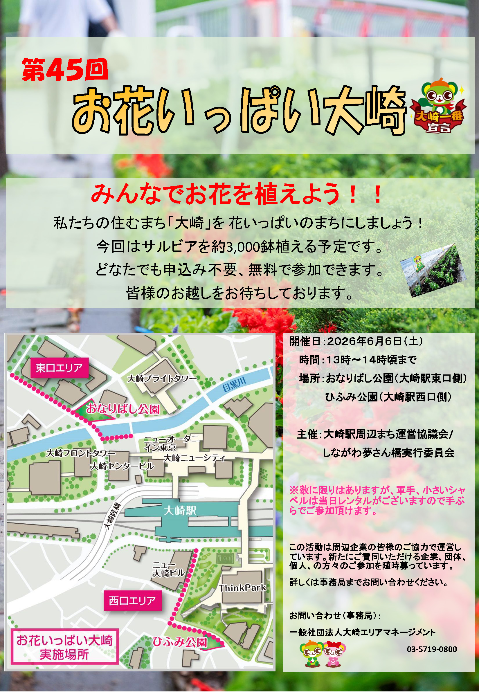 大崎にお住まいの方、お勤めの方、お子様からご高齢者まで、誰でも大歓迎!ーー通りに花が咲く、優しく美しいまち大崎へ、ぜひ皆様の応援を!