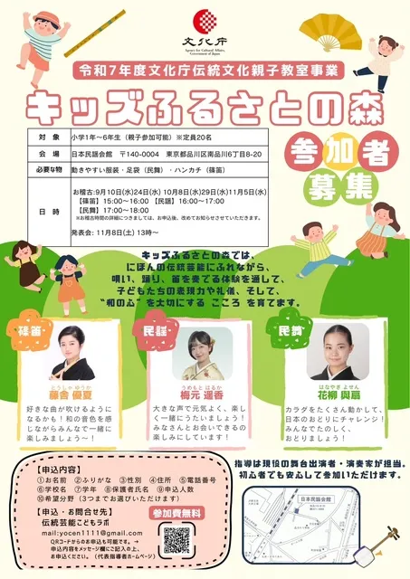 文化庁伝統文化親子教室として、「キッズふるさとの森」を開講。日本の伝統文化にふれながら、唄い・踊り・奏でる体験を通して、子どもたちの表現力や礼儀、そして和の心を育み、挑戦する楽しさや達成感が未来へつながるきっかけになることを願い実施する。初心者の子どもでも安心して参加できる内容となっており、親子での参加も可能。現役で活躍する実演家が心を込めて丁寧に指導。