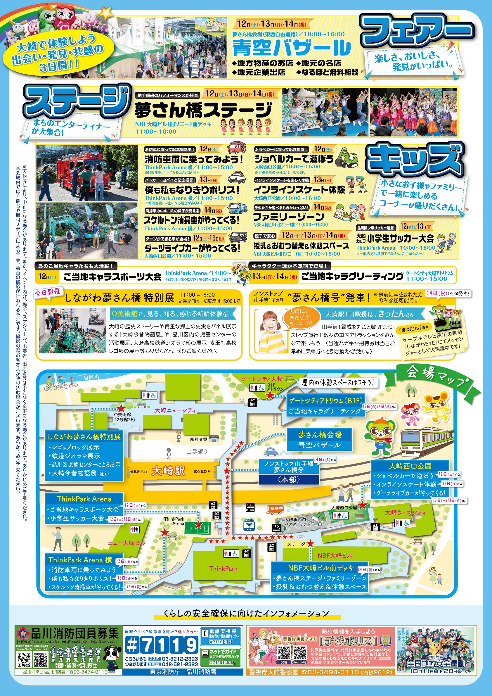 会場内ではステージ・各地方の物産展・各種団体のブースが数多く立ち並び大変賑やか。最終日には毎年恒例の大人気イベント、大崎発 大崎着のノンストップ山手線が走り、1編成の山手線にほぼ満員の申込者が乗車。車内でも様々な催しが行われる。ご当地キャラやゆるキャラも多数参加。品川文化振興事業団では品川ゆかりアーティストが4ブースほど出店。