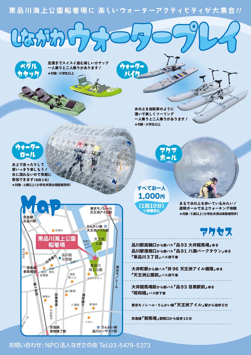 東品川海上公園の船着き場に、アクアボール、ウォーターロール、ウォーターバイクなど、