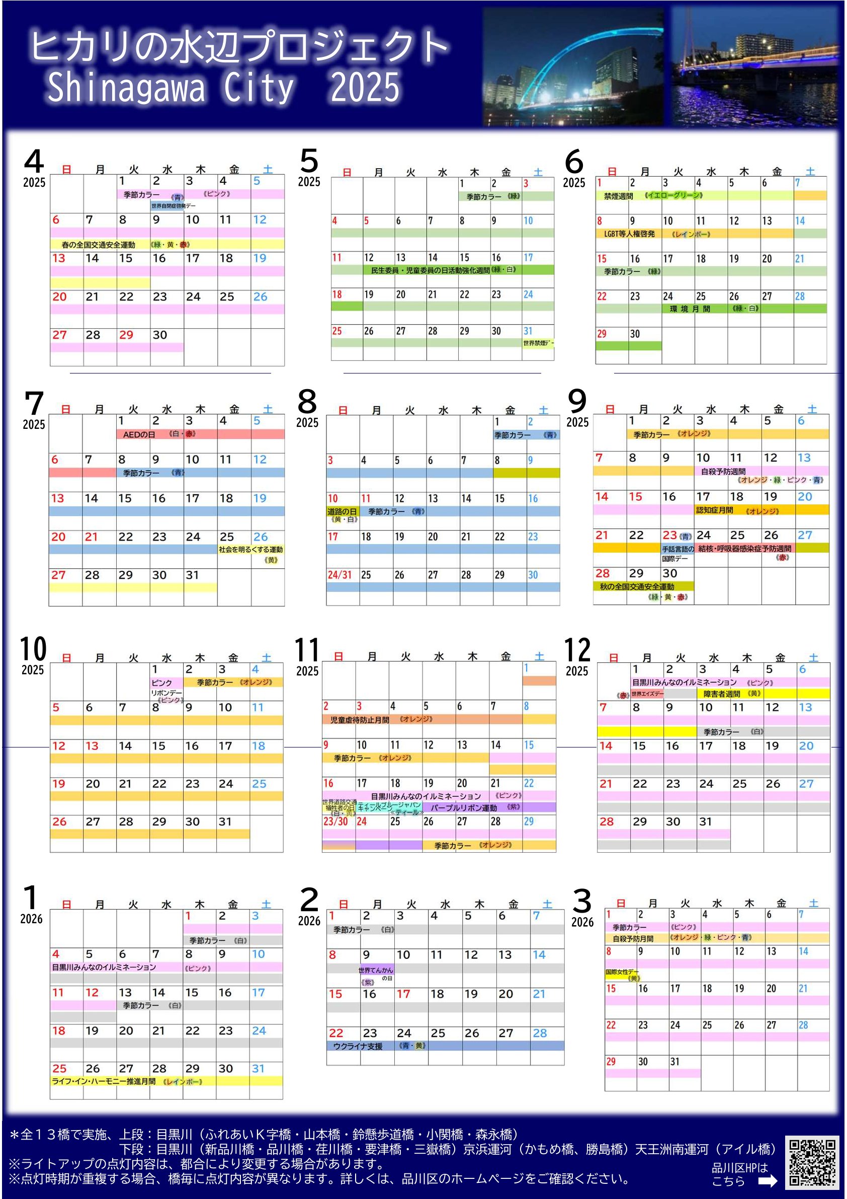 区内の水辺が多くの人でにぎわう観光・交流の軸となることを目指し、“ヒカリの水辺プロジェクト“として平成30年度から令和2年度までに目黒川や京浜運河、天王洲南運河に架かる13の橋にライトアップ施設を整備。現在、季節に応じたライトアップや品川区が賛同しているアウェアネスリボン運動・イベント等と連携したライトアップを実施しています。