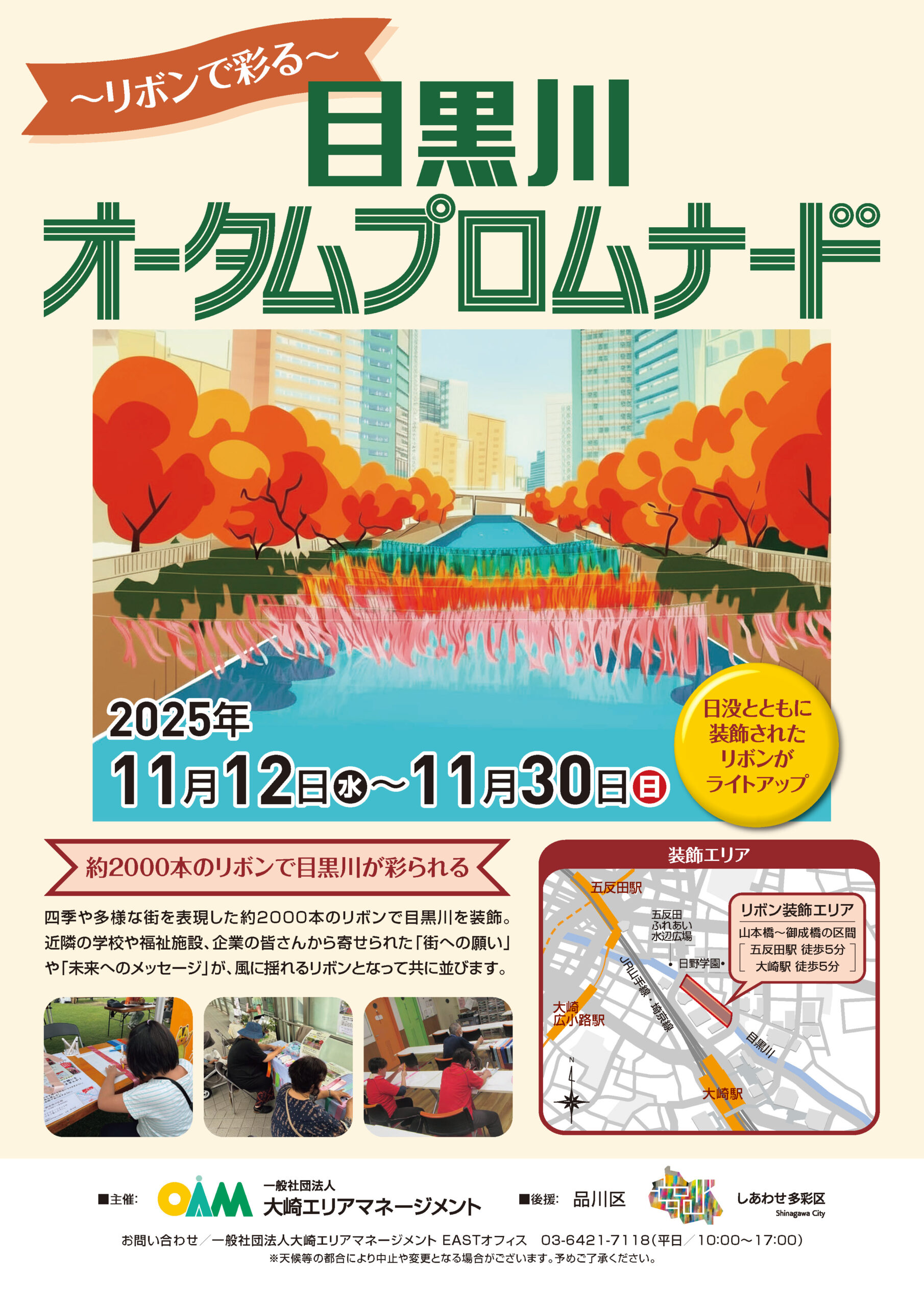 四季や多様な街を表現した約2,000本のリボンで目黒川を装飾します。