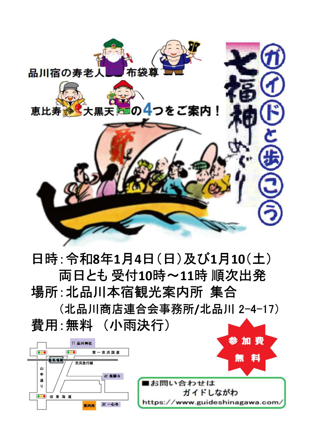 【コース】北品川本宿観光案内所に集合した後、寿老人/一心寺、布袋尊/養願寺、大黒天/品川神社、恵比寿/荏原神社をお詣りしながら新春の品川宿を巡ります。